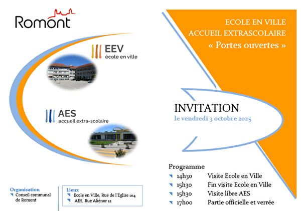 La Commune de Romont rappelle à la population son invitation à la journée "Portes ouvertes" de l'Ecole en Ville et de l'Accueil extrascolaire, le vendredi 3 octobre 2025.